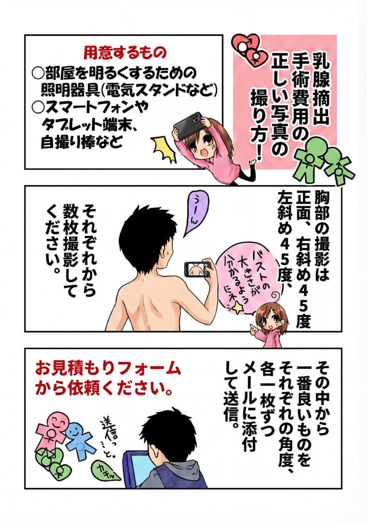 胸オペ(乳房切除)の見積もりや陰核陰茎(ミニペニス)形成に必要な条件を満たしているか判断させて頂く場合、胸部写真(正面+斜め左右)やクリトリスの現状がわかる写真をお送り頂いております。